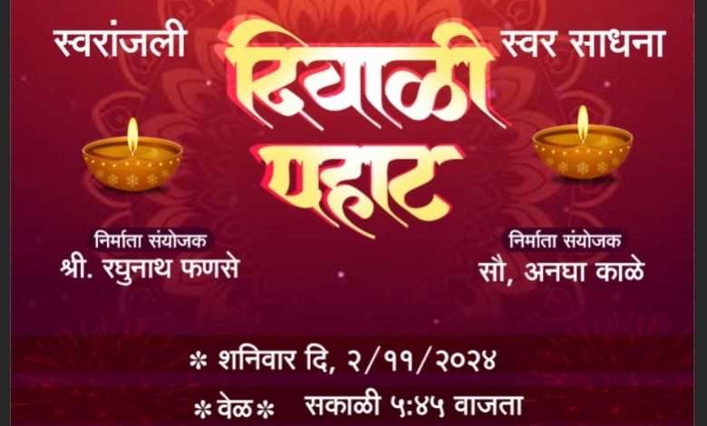 “स्वरांजली” निर्माता संयोजक रघुनाथ फणसे व “स्वर साधना” निर्माता संयोजक अनघा काळे आणि त्यांचे सहकारी हा कार्यक्रम सादर करतील. अशी माहिती एम. डी. चौधरी यांनी पत्रकाद्वारे दिली. हा कार्यक्रम सर्वांसाठी विनामूल्य आहे. तरी सर्वांनी सहपरिवार या कार्यक्रमाला उपस्थित राहून संगीतमय दिवाळी पहाट साजरी करुया.
