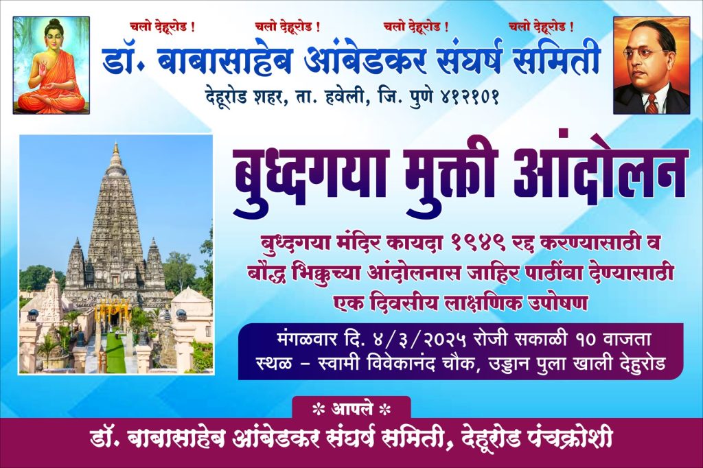 बुध्दगया महाबोधी महा बुध्दविहाराचा ब्राम्हण मुक्त होण्या साठी व महाबोधी महाविहार बुध्दगया १९४९ चा कायदा रद्द करण्यासाठी बौध्द भिख्कु संघाचे आंदोलन सुरु आहे, या आंदोलनास पाठींबा देण्यासाठी बुध्दगया मुक्ती साठी एक दिवसीय लाक्षणिक आंदोलन डॉ .बाबासाहेब आंबेडकर संघर्ष समितीच्या वतीने मंगळवार दि ४ मार्च रोजी सकाळी १० वाजता स्वामी विवेकानंद चौक देहुरोड येथील उड्डाणपुलाच्या खाली करण्यात येणार असल्याची माहिती धर्मपाल तंतरपाळे यांनी पुणे खबर वृत्तवाहिनीला दिली
