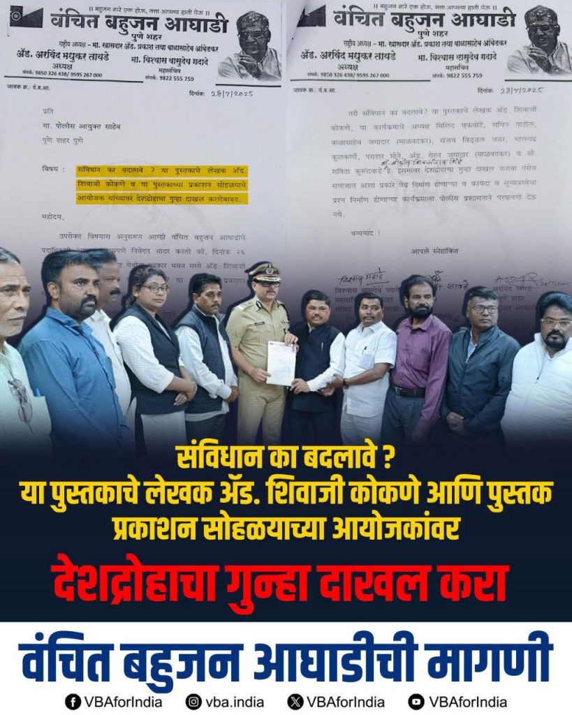 ‘संविधान का बदलावे?’ पुस्तकाच्या लेखकावर देशद्रोहाचा गुन्हा दाखल करण्याची वंचित बहुजन आघाडीची मागणी.