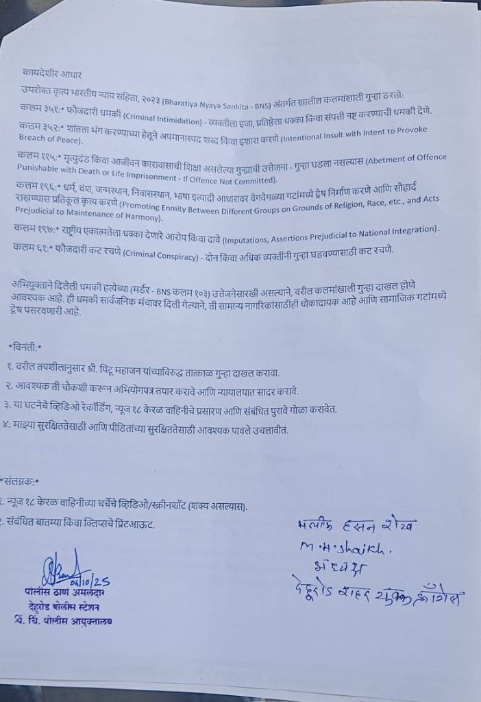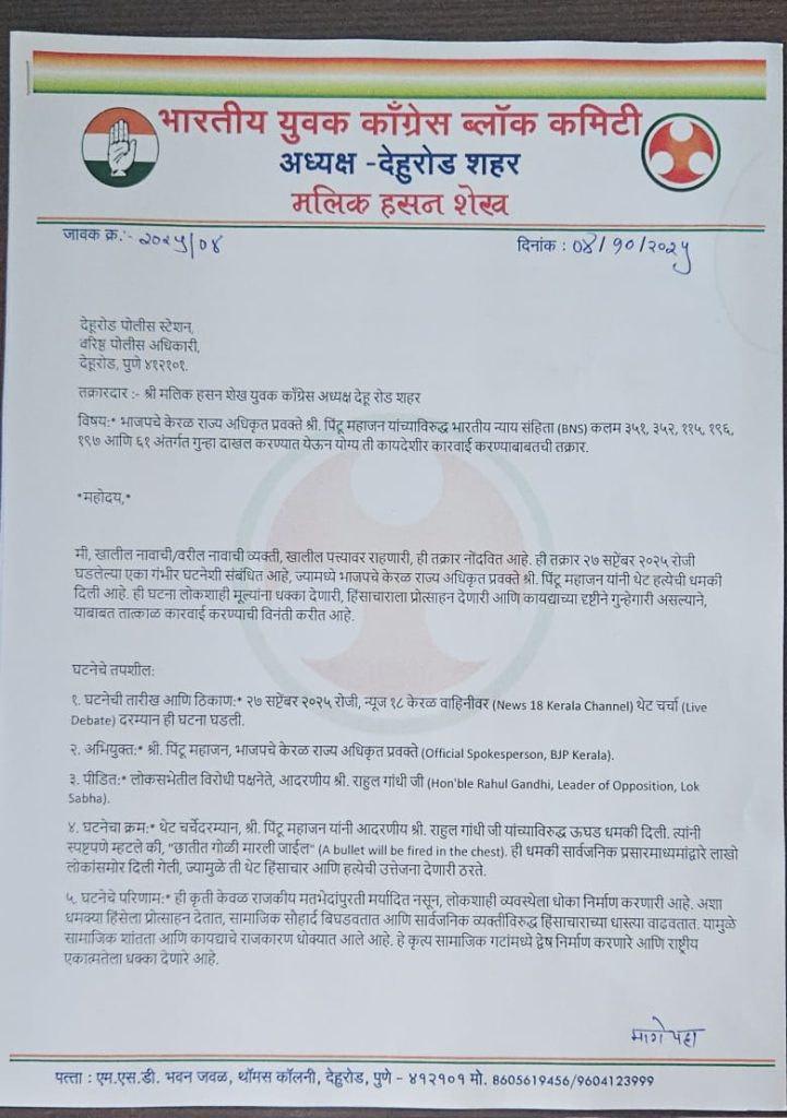 लोकसभा विरोधी पक्षनेते आणि काँग्रेसचे ज्येष्ठ नेते राहुल गांधी यांच्याविरोधात केरळ भाजपाच्या प्रवक्ते प्रिंटू महाजन यांनी दिलेल्या आक्षेपार्ह वक्तव्याच्या निषेधार्थ देहूरोड युवक काँग्रेसने आज देहूरोड पोलिस स्टेशनमध्ये तक्रार दाखल केली. या वक्तव्यामुळे देशभरातून राजकीय वातावरण तापले असून, युवक काँग्रेसने या प्रकरणात योग्य कायदेशीर कारवाई करण्याची मागणी केली आहे. महाराष्ट्र प्रदेश युवक काँग्रेसचे अध्यक्ष शिवराज दादा मोरे यांच्या सुचनेनुसार आणि भारतीय राष्ट्रीय युवक काँग्रेसचे अध्यक्ष उदयभानू चिब यांच्या नेतृत्वाखाली भारतीय राष्ट्रीय काँग्रेसच्या आदेशानुसार करण्यात आली.या प्रकरणाची पार्श्वभूमी अशी की, २८ सप्टेंबर २०२५ रोजी न्यूज १८ केरळ वाहिनीवर झालेल्या एका लाईव्ह डिबेट कार्यक्रमात प्रिंटू महाजन यांनी राहुल गांधी यांच्याविरोधात ‘छातीत गोळी झाडू’ असे धमकीचे वक्तव्य केले. हे वक्तव्य सोशल मीडियावर व्हायरल झाले असून, काँग्रेस कार्यकर्त्यांमध्ये संतापाची लाट उसळली आहे. या वक्तव्याला काँग्रेसने ‘हिंसेची भाषा’ आणि ‘लोकशाहीविरोधी’ ठरवले असून, देशभरातील काँग्रेस कार्यकर्ते या प्रकरणात भाजपावर टीका करत आहेत.देहूरोड युवक काँग्रेसचे अध्यक्ष मलिक शेख यांच्या नेतृत्वाखाली ही तक्रार दाखल करण्यात आली. तक्रारीत म्हटले आहे की, असे वक्तव्ये लोकशाही मूल्यांना धक्का लावणारे असून, याबाबत तात्काळ गुन्हा दाखल करून प्रिंटू महाजन यांच्यावर कठोर कारवाई करण्यात यावी अशी मागणी करण्यात आली.
