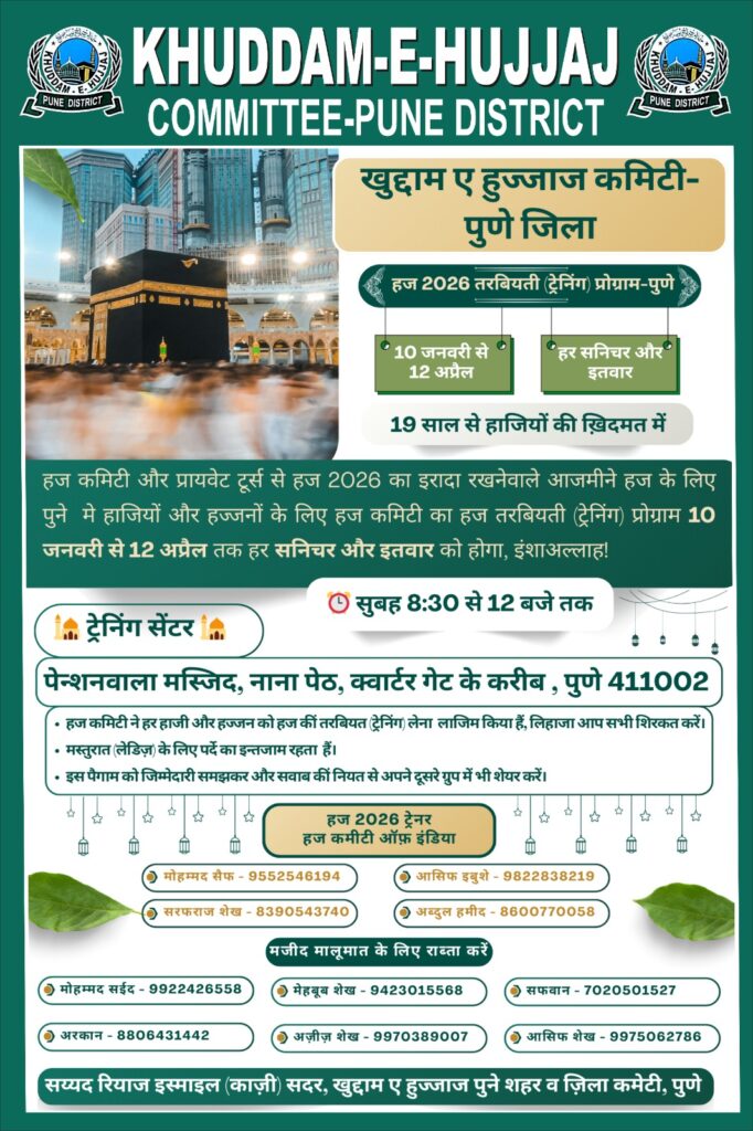 हज यात्रा २०२६ साठी निवड झालेल्या यात्रेकरूंना योग्य धार्मिक, व्यवहारिक व आरोग्यविषयक माहिती मिळावी, या उद्देशाने खुद्दामे हुज्जाज पुणे जिल्हा कमिटीच्या वतीने १० जानेवारी ते १२ एप्रिल २०२६ या कालावधीत विशेष तरबियती (प्रशिक्षण) कार्यक्रमाचे आयोजन करण्यात आले आहे. हा प्रशिक्षण कार्यक्रम पेन्शनवाला मस्जिद, नाना पेठ, पुणे येथे दर शनिवारी व रविवारी आयोजित करण्यात येत आहे.