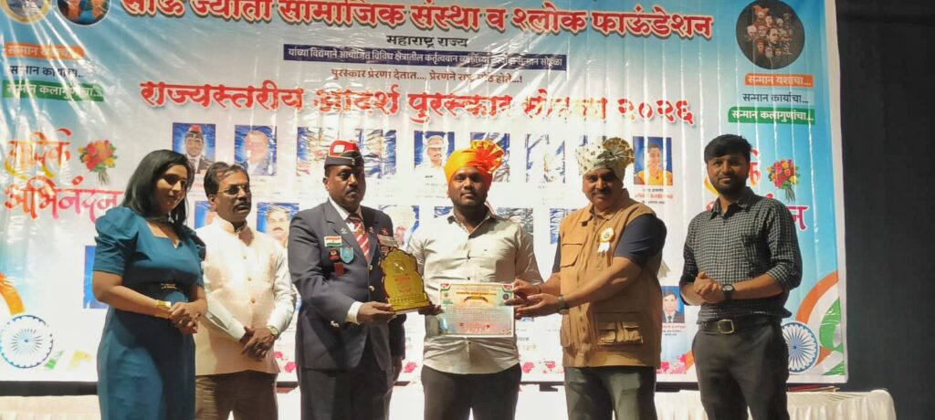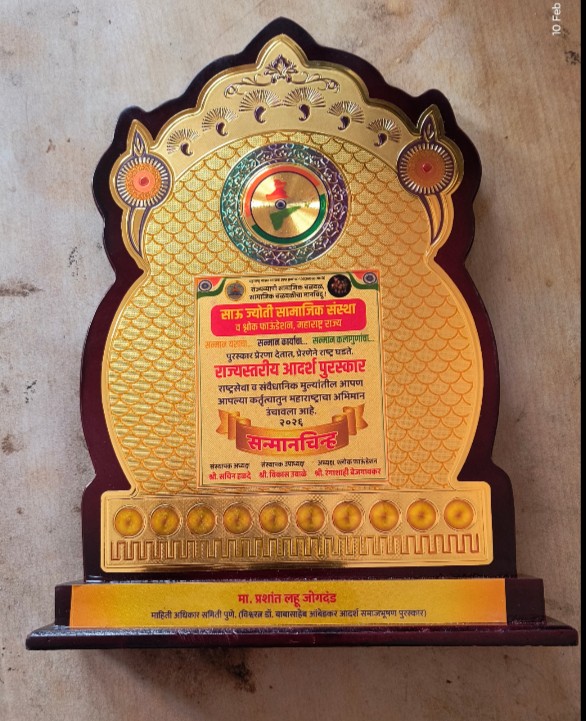 पुणे, १० फेब्रुवारी २०२६ (विशेष प्रतिनिधी) : साऊ ज्योती सामाजिक संस्था व श्लोक फाउंडेशन माता रमाई आंबेडकर संस्था यांच्या संयुक्त विद्यमाने आयोजित राज्यस्तरीय आदर्श पुरस्कार सोहळा २०२६ मध्ये देहूरोड (पुणे) येथील माहिती अधिकार व सामाजिक कार्यकर्ते प्रशांत लहू जोगदंड यांना “राज्यस्तरीय विश्वरत्न डॉ. बाबासाहेब आंबेडकर आदर्श समाजभूषण पुरस्कार” प्रदान करून गौरविण्यात आले.